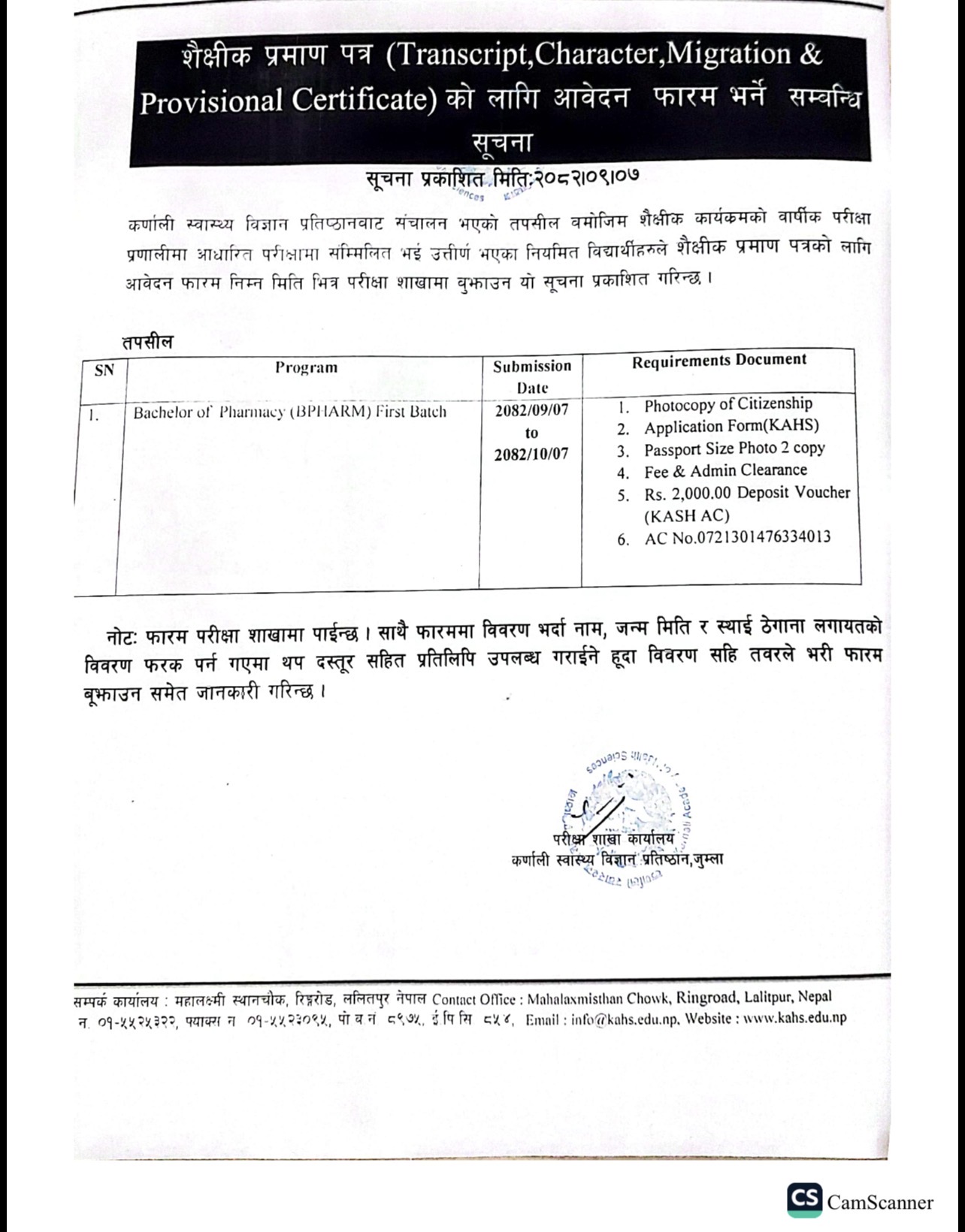 शैक्षीक प्रमाण पत्र (Transcript, Character, Migration & Provisional Certificate) को लागि आवेदन फारम भर्ने सम्बन्धि सूचना (Bpharm 1st batch)