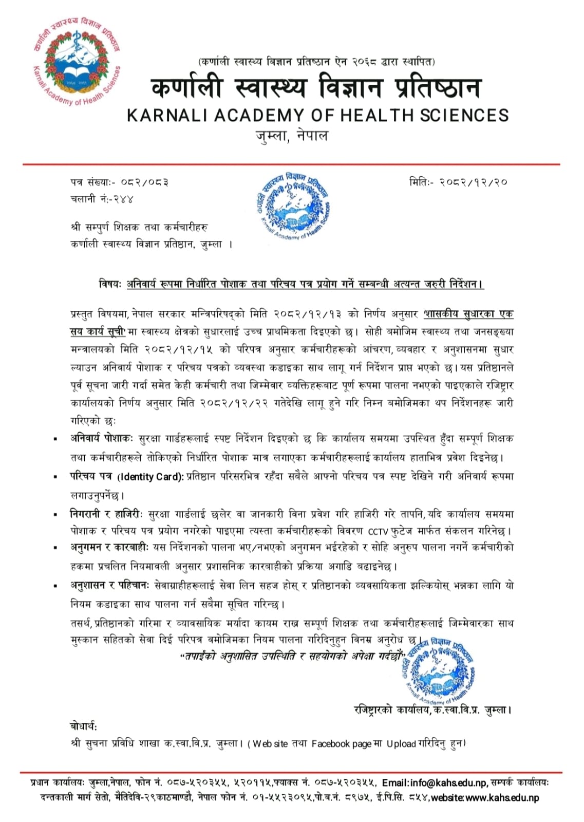 अनिवार्य रूपमा निर्धारित पोशाक तथा परिचय पत्र प्रयोग गर्ने सम्बन्धी अत्यन्त जरुरी निर्देशन।