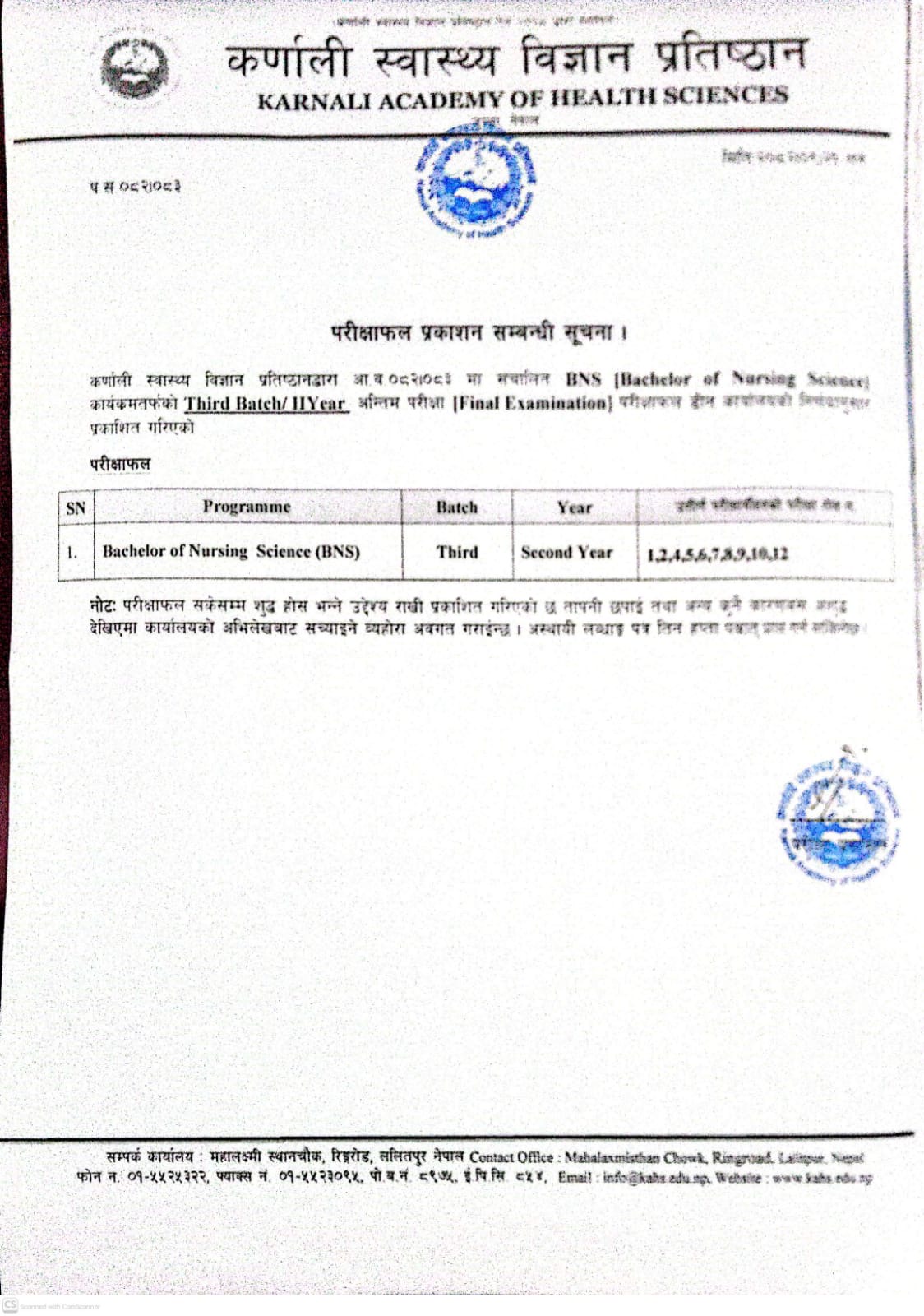 BNS Final Result - 3rd batch 2nd Year
